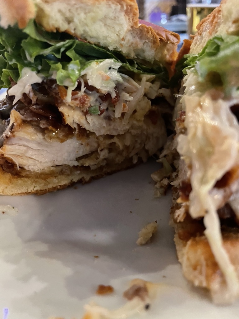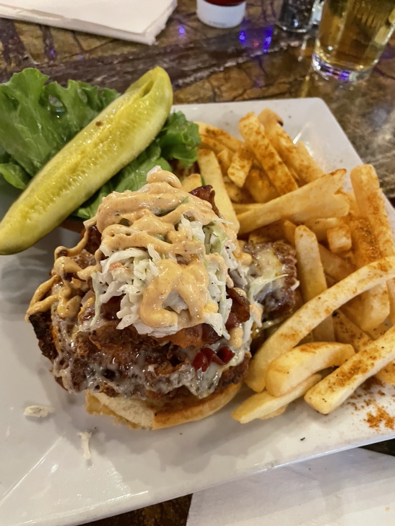 Of course the second time I went back, I needed to try other items. We came to celebrate Dad’s birthday. Wings were ½ off, so we started with an order of them with the hot sauce on the side. They were crispy, delicious and the hot sauce had the perfect kick! 9/10 for the wings. I ordered the buttermilk fried chicken sandwich. It was on a brioche bun, with pepper jack cheese, Cajun mayo, bacon and a rustic ranch slaw. They were served with old bay fries, which was a surprising delicious combination! The chicken was perfect fried, crispy and juicy all at the same time!