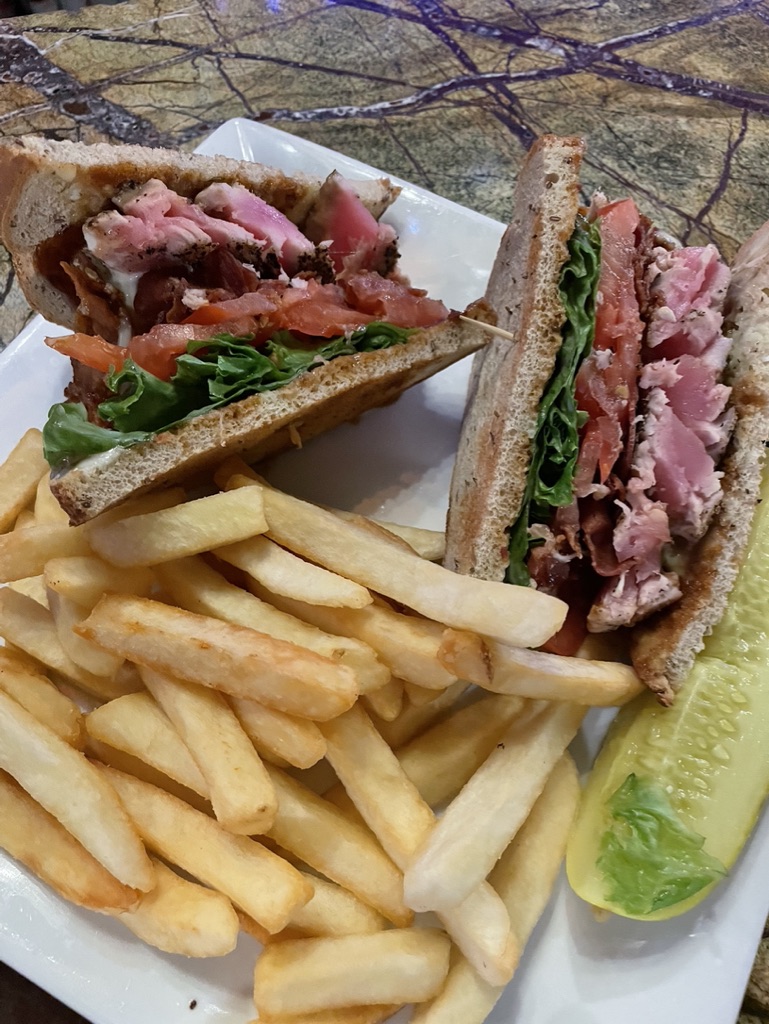 The two sandwiches we ordered to share was the GAP grilled cheese. It was on sourdough bread and stuffed with cheese, bacon, avocado and tomato! Another 10/10. Second sandwich ordered was the Ahi Tuna BLT. On rye toast stuffed with the perfectly seared Ahi, bacon, lettuce, tomato, avocado and a wasabi mayo soy glaze that was the perfect combination. I give this an 11/10!!! Both sandwiches came with fries that were crunchy, but soft on the inside. They were pretty damn good!