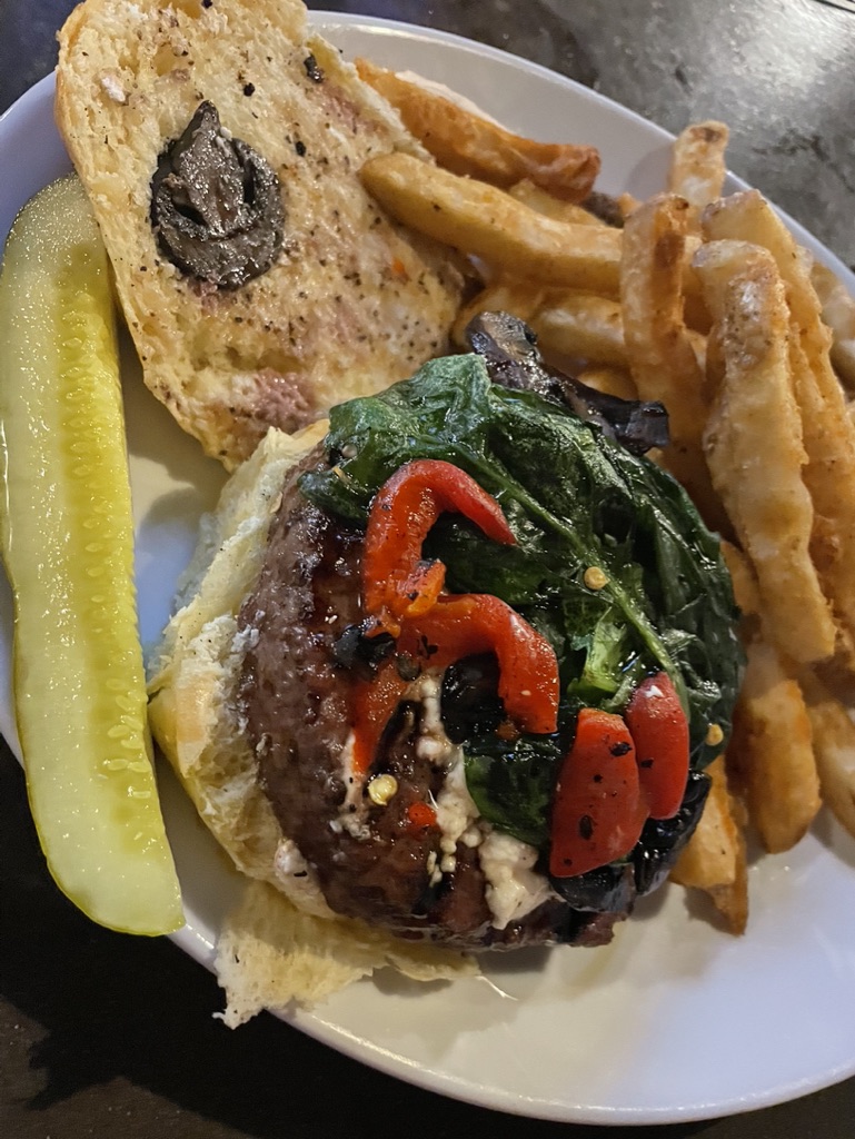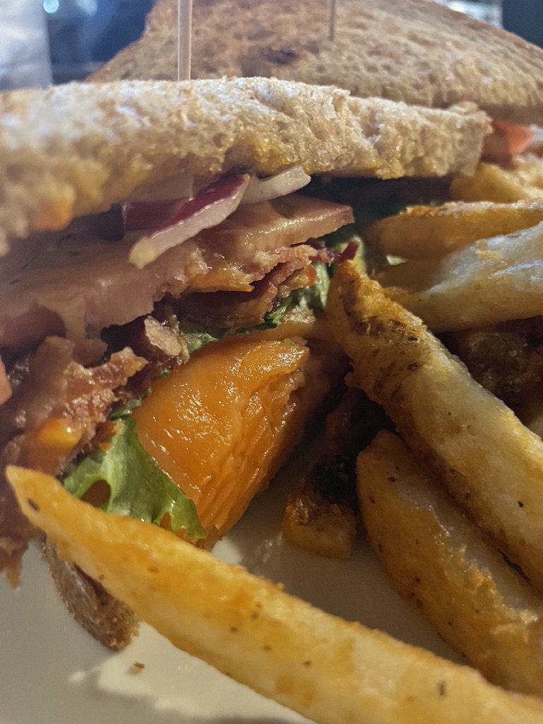 Menu: Both mom and I looked at the menu before going. We had to look at all the options to help narrow down what we may want. The menu has lots of options but all we knew was we wanted to get something delicious, but not heavy as we were about to sit through a show. We decided one ordering two different sandwiches to split! The first was the smoked salmon BLT. This sandwich on a sourdough bread with garlic aioli was so good. 8/10 for this sandwich. The second was the honey goat burger. It was topped with goat cheese, mushrooms, roasted red peppers, spinach and a honey drizzle. 10/10 on this burger. Would definitely order it again! The fries were the best. Lightly seasoned, crispy but soft and hot on the inside! Click here to see more of the menu!