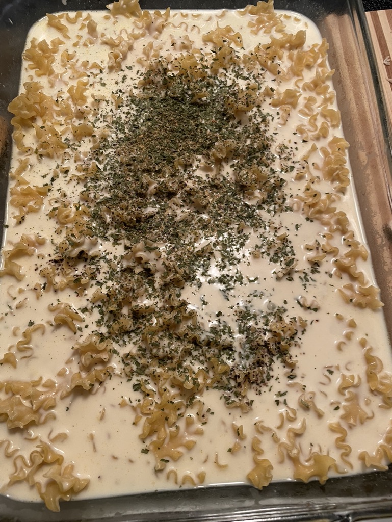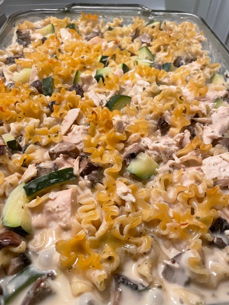 This is another easy dump recipe! First preheated the oven to 425. I sprayed the glass dish with cooking spray. Next I dumped the pasta, Alfredo sauce, chicken broth, heavy cream and seasonings. Mixed all together until combined. Then I added in the veggies and chicken and combined. I covered with foil and baked for about 35 minutes. I took it out then covered with mozzarella and parmesan cheese and baked uncovered for another 10 minutes.