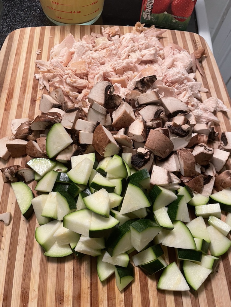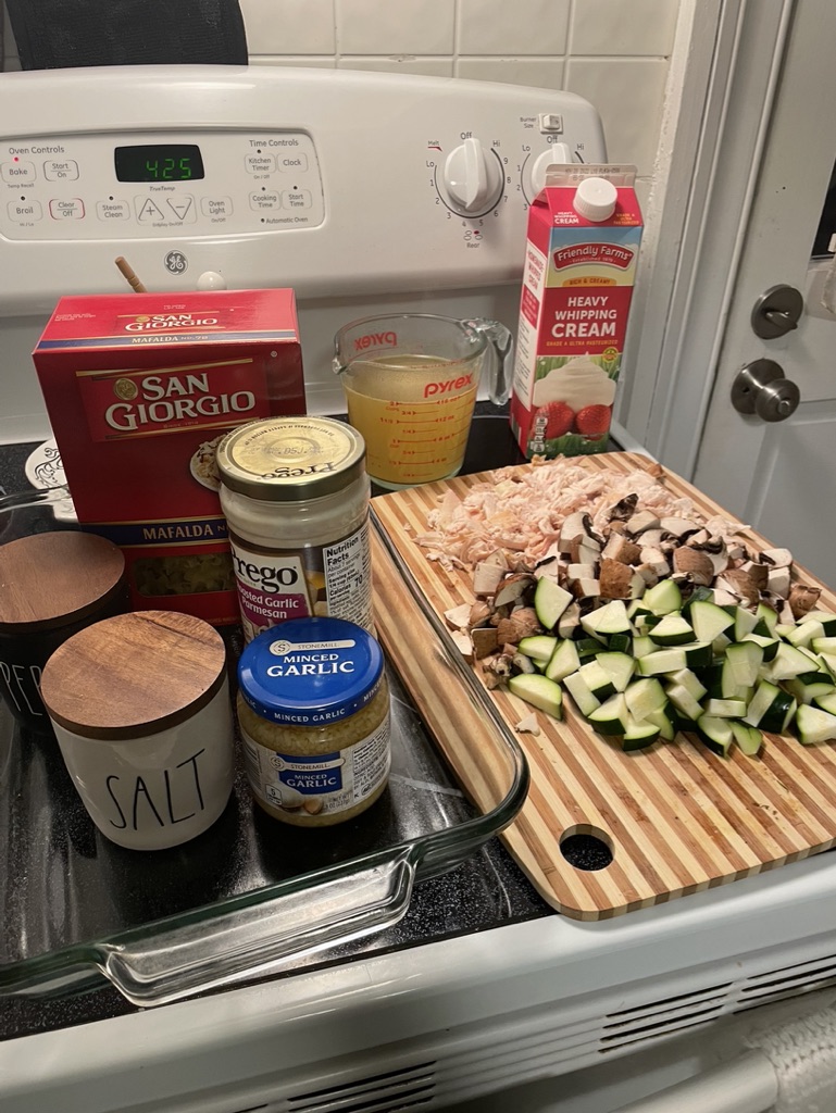 1 box of pasta, 1 jar of Alfredo sauce, salt, pepper, garlic and any other seasonings you choose. I used some Italian seasoning and parsley. I chopped up 1 chicken breast of the rotisserie chicken, mushrooms and zucchini. Also need 2 cups of chicken broth and about 1 cup of heavy cream.
