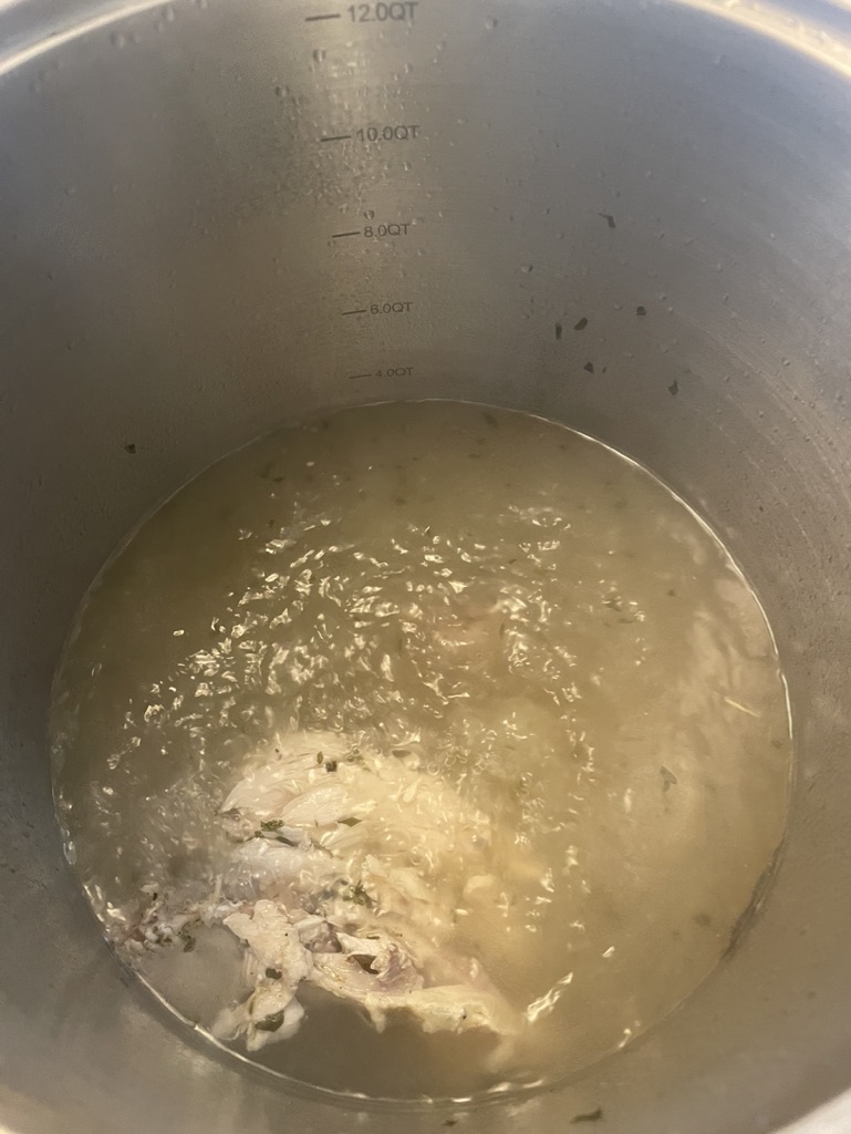 After removing the wings from the rotisserie chicken and having them as a meal with some rice (meal #3 from this one chicken), I also removed the legs and thighs and set them aside for another time. Meal #1 used one breast, this recipe used the other. I took the second breast and all the bones, placed them in a stock pot with about 4-5 cups of water. I added salt, white pepper, black pepper, season salt, parsley and some adobo seasoning. I allowed this to simmer for about 20-30minutes.