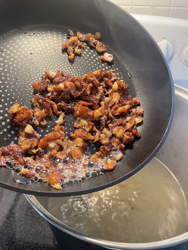 It continue to simmer and I then added some chopped mushrooms and a cup of wild rice. I removed the bones and continued to simmer as the soup came together. I removed any meat left on the bones and placed it back in the pot. In the same frying pan as before, I sautéed the chopped ginger and chicken skin then added to the pot for more flavor! After about another 20 minutes, I added some Worcestershire sauce, some sage and thyme and gave it all stir. Once the rice is not hard and cooked through, its ready to enjoy! The key is to continue stirring as it simmers, to make sure it does not stick to the bottom. Last ingredient needed for serving was some cheese! I topped with some parmesan and it was the perfect soup for a cold day!