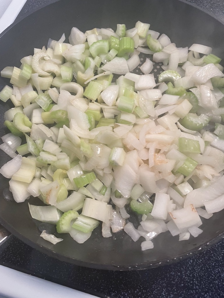 As the broth simmered, I chopped an onions, celery, garlic, ginger and some of the chicken skin. In a pan, I sautéed the onions, celery and garlic for just a few minutes. I added them to the broth. I tasted it periodically to see if I needed to add any more salt, pepper or any other seasonings and added what was needed.