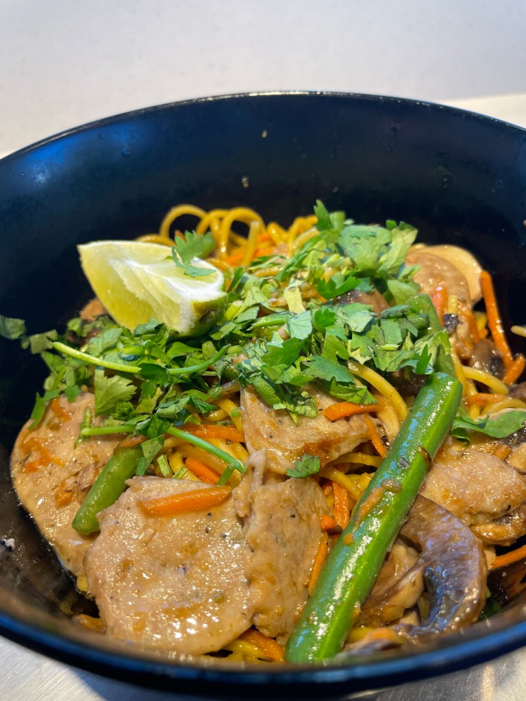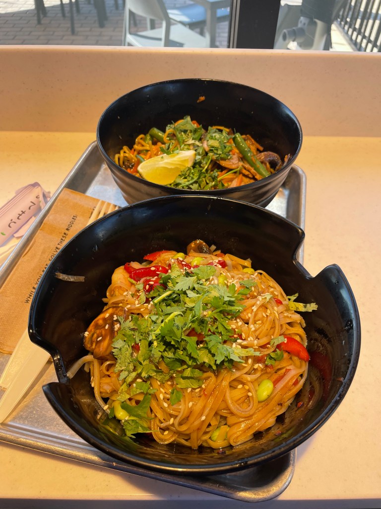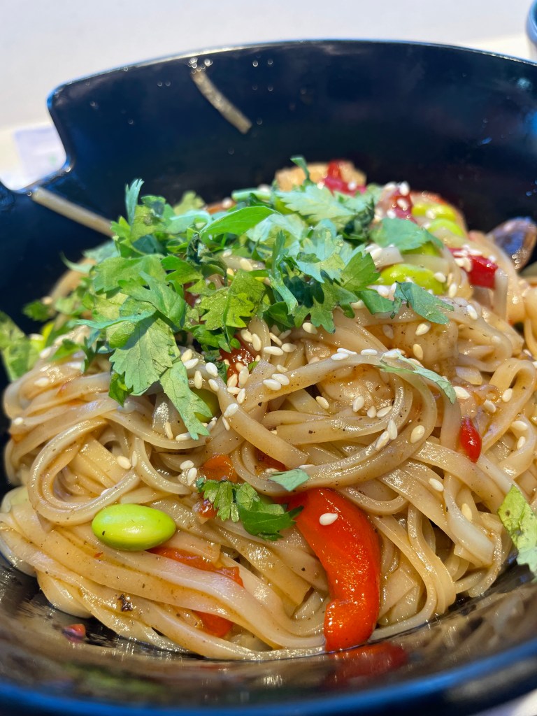 Menu: They have a variety of preset menu items. Noodles are the main base, but they also offer salads and rice. Mom and I decided to do create your own stir fry. We each ordered something different to share and taste more of the menu. First bowl had egg noodles as the base. We topped the bowl with Italian sausage, green beans, mushrooms, carrots, fresh lime and cilantro. Then finished with sesame garlic sauce. It was super garlicky- but mom and I loved it. 10/10! The second bow had a rice noodles, topped with shrimp, roasted red peppers, edamame, sesame seeds and cilantro. This bowl was finished with a sweet soy five spice sauce. Another 10/10! I preferred the second bowl and mom preferred the first bowl more. So we shared them but were able to enjoy our favorites more! See the menu click here!