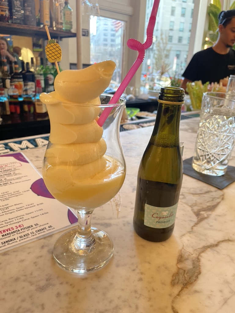 Drinks: We came for drinks and they delivered! I decided to just order the Citrus & Salt House Margarita with blood orange flavor. 10/10 as it was made strong, but not potent. It was perfectly tart with a hint of sweet! Mom ordered a soft serve mimosa. It was the daily sorbet, pineapple flavor, with a mini bottle of presco. Another fun and 10/10 drink! Click here to see the full drink menu!