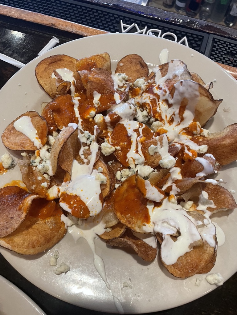 Menu: They have a large menu, and as I am sure you can tell from the name, wings are a signature! LOL. We knew we were getting wings, but it was which of the 30 some sauces offered do we want, and what else do we want! We started with fried mushrooms. Their spicy beer batter was light, yet crispy and the mushrooms juicy! They were served with a ranch dipping sauce and get an 8/10! We also ordered the buffalo chips. House made chips, topped with hot sauce, ranch and blue cheese crumbles! They were hot, yet creamy and crunchy (10/10). For wings, we ordered the platter of 25 wings and were able to pick 5 sauces. Not easy, but we decided on: Gold Rush, The Slayer, Nashville Hot, Mad Anthony’s BBQ and Red, Hot & Blue. They were all pretty delicious, but my favorite was the Red, Hot and Blue as you could taste the blue cheese cooked into them. Overall wings get a 9/10. Click here to see the full menu.
