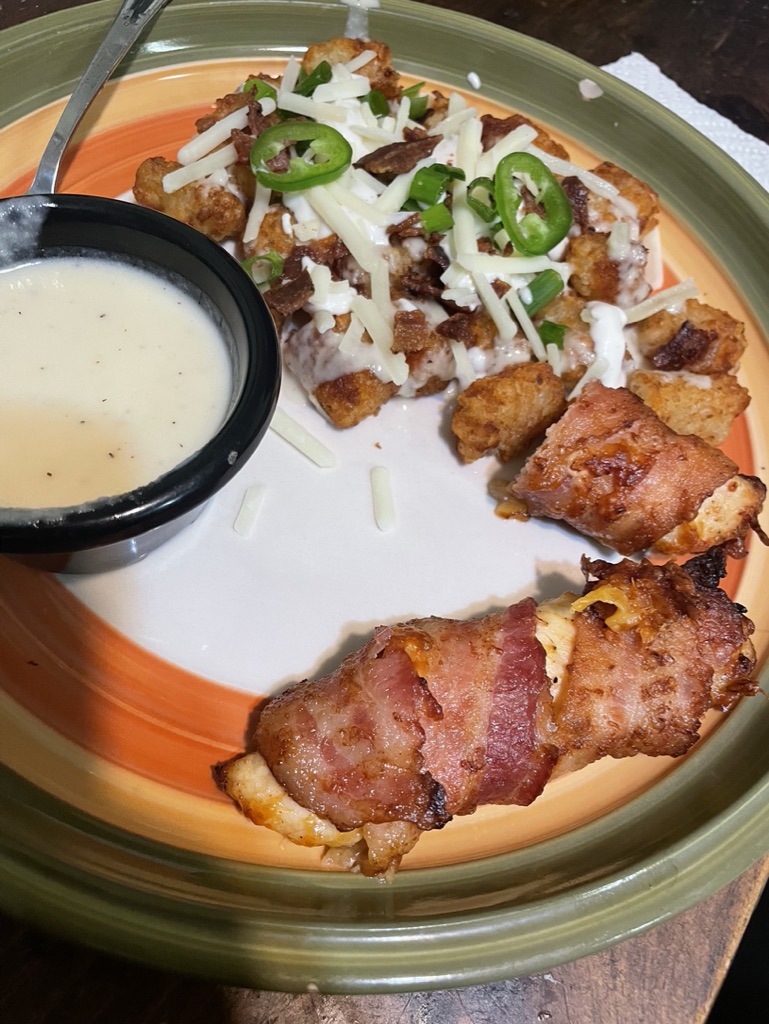 It’s so simple, yet it was very delicious. Take chicken tenderloins and season them with your favorite chicken seasoning. Take a cheese stick (I used Colby jack) and one chicken tender and then wrap it with a slice of bacon. Air fry at 400 for about 18minutes. The cheese melted a bit more than I wanted it to (maybe adding the pickle spear will help avoid that next time). But it became the perfect bite/snack. I dipped in the beer cheese dip and some bites with ranch and it was perfect. Now I may see what other bacon wrap bites should be made in the air fryer! Comment your ideas below!