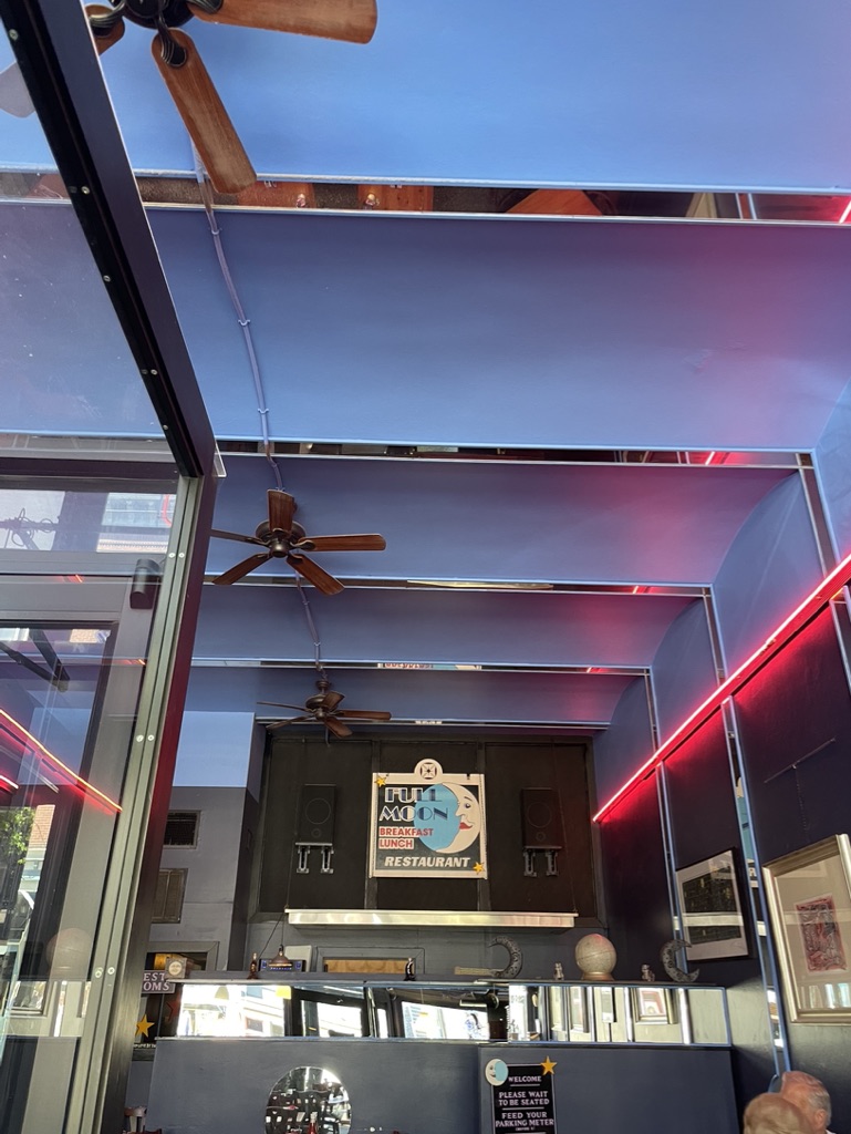 Ambiance/Atmosphere: This fun and stellar café is decorated with neon lights and space décor. It gives a bit of the old diner vibe with the silver mirror panels but also space vibes with darker paint walls. The staff were so friendly, welcoming and made you feel like you were a part of the family. They do a special dinner once a month for the full moon. It was the morning after this dinner and a busy night, but it didn’t change the vibe they set.