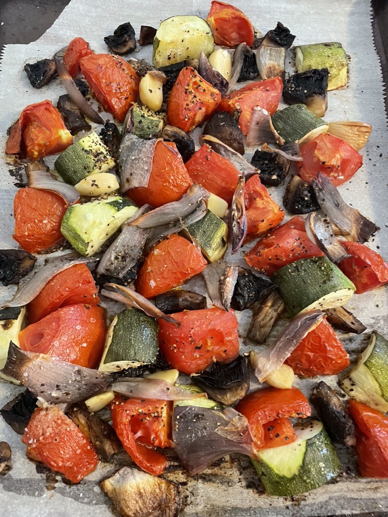 I already has some roasted red peppers. On a sheet pan, I roasted some zucchini, red onions, mushrooms, tomatoes and garlic gloves. Once all was roasted I added to a blender with the roasted red peppers, fresh basil, shredded parmesan and some EVOO. I blended it until smooth, and added some salt and pepper to taste.