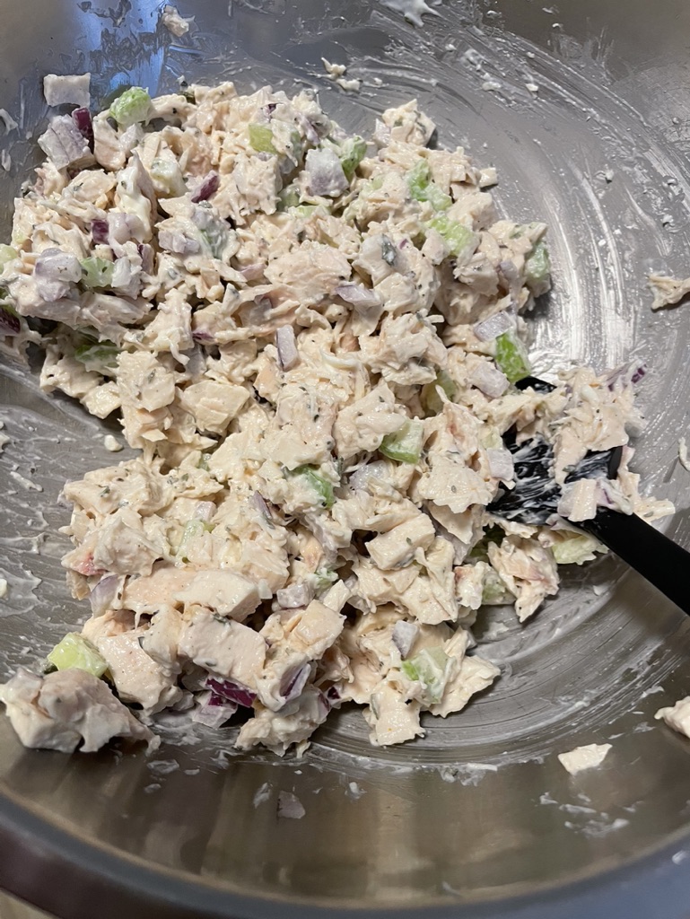 After pulling chicken for the pesto pasta, I decided to remove the remaining chicken from all the bones. I had 1 breast, dark meat from the leg and thighs and some meat from the wings as well as all the chicken skin left. I don’t like wasting and want to try and use all that I can! Next recipe was to use the remaining white meat – I decided to make chicken salad. I chopped up the chicken, red onions and celery. I seasoned with salt, black pepper, white pepper and parsley. I then added a big dollop of mayo and combined. Gave it a taste, added some more pepper and mayo and then mixed all together. This was another great meal prep option for lunch. It was great with salad. I also added it to a wheat wrap with some shredded mozzarella and then grilled it in the pan. It was a delicious warm lunch!