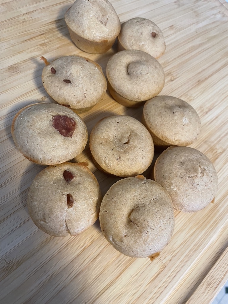 I ate them with some syrup. It could have been the protein mix that I used, but they were not sweet enough for me. I think next time I want to add syrup in the batter before baking. The sausage links were my favorite. If I use bacon again, it needs to be more and thicker cut. The ham was okay- but I don’t think will make use that again. If you have an ideas/suggestions to level these up – comment below!