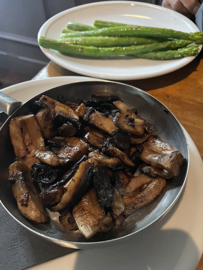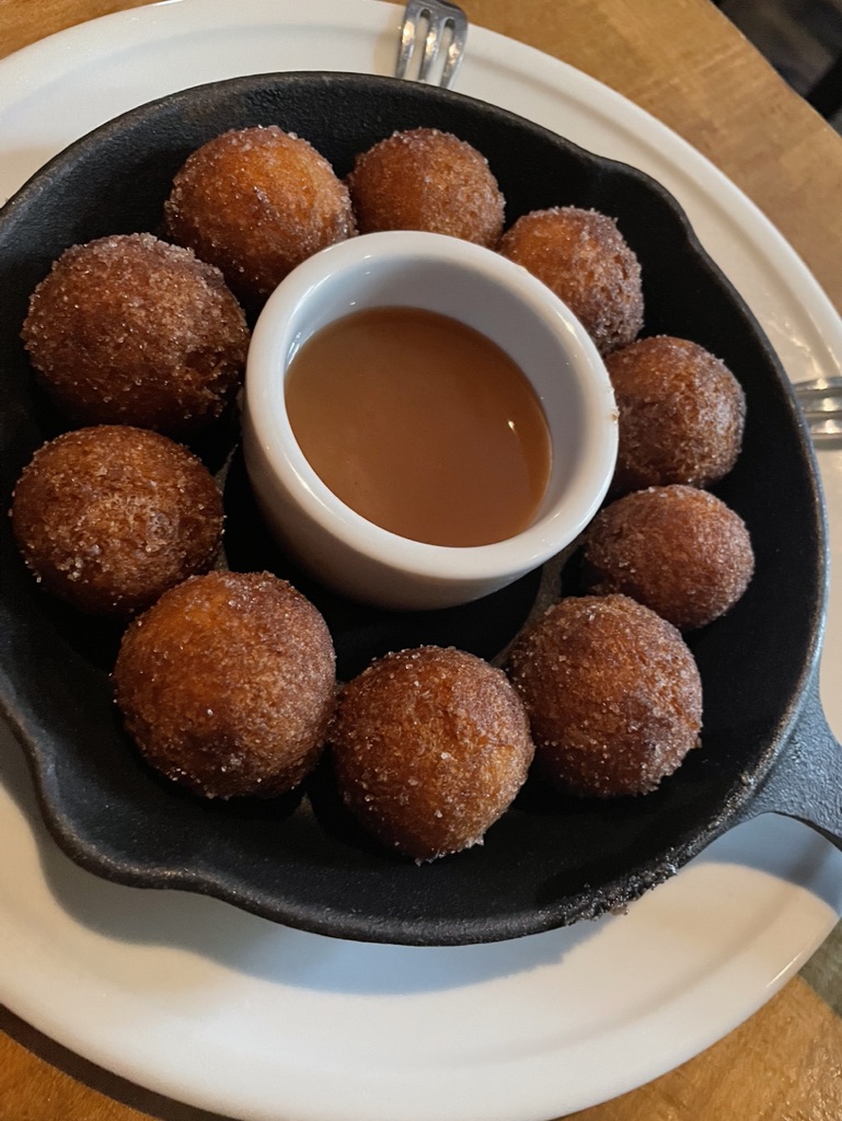 The waitress said that cowboy ribeye was the go to favorite β so that is what I went with. The Hawke keeps their steak the star and offer sides by the plate. I added mushrooms and mashed potatoes and they each came out on a separate plate. Once seeing everything I understood why they kept the steak separate. It was a beaut and just as delicious as it looked. The bite of a mushroom, steak and mashed potatoes were so good. I ordered the steak rare and it came out perfect. I am now dreaming about having more as I share with you! It was large, 18oz and I felt like it was seasoned very well. I ended up saving a bit of everything for a nice left over, for room for dessert. But I probably could have ate it all if I skipped dessert! To go with the espresso martini, I ordered the mini donuts. They were dusted with cinnamon and sugar with a caramel dipping sauce. They were the small bite of what is needed to end a wonderful dinner experience. I had some leftover, that paired very well with coffee.