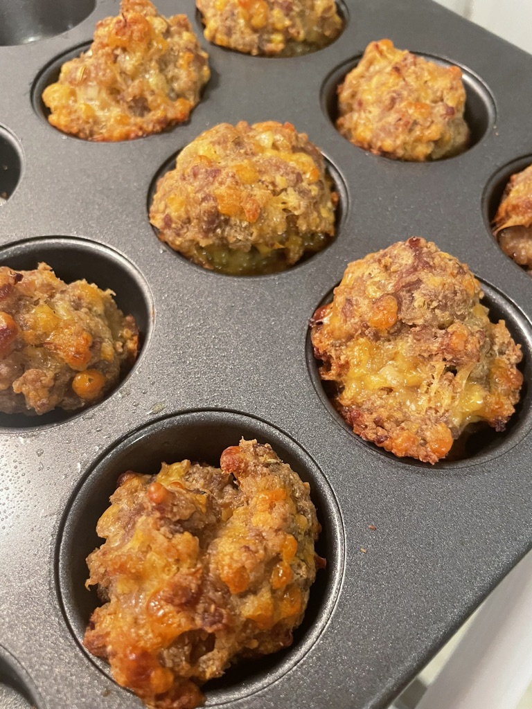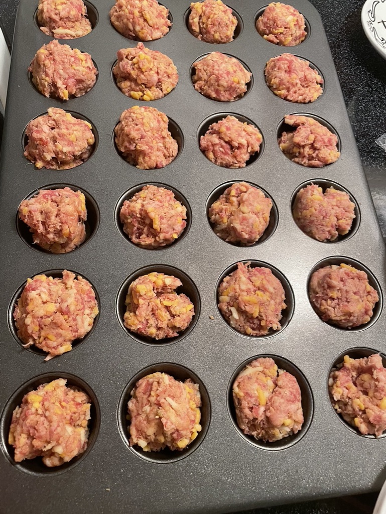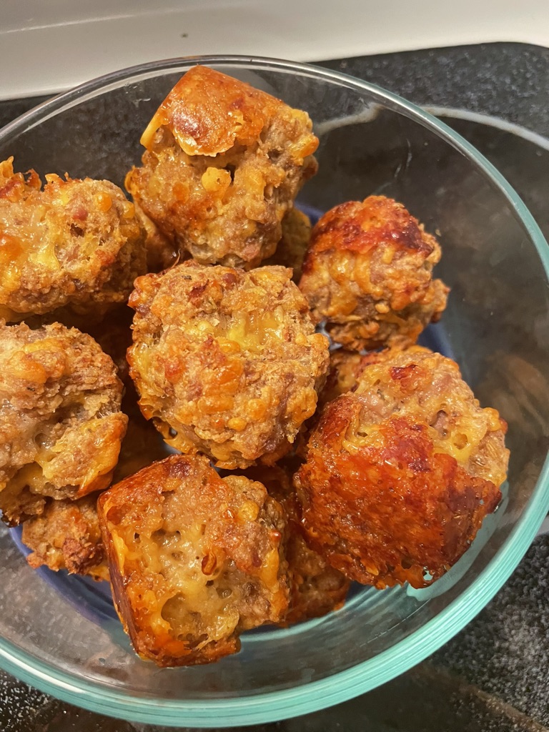 First I preheated the oven to 350. Then I sprayed my mini muffin pan. In a bowl I added one pound ground pork sausage, 1 cup Kodiak pancake mix and 2 cups of shredded cheddar cheese. I seasoned with some salt, white pepper, black pepper and dried sage. I combined everything together with my hands so it was well blended. I divided this all into the mini muffin pan and baked for about 18-20minutes. They came out crispy little sausage bites. I also find them to be pretty filling as well.