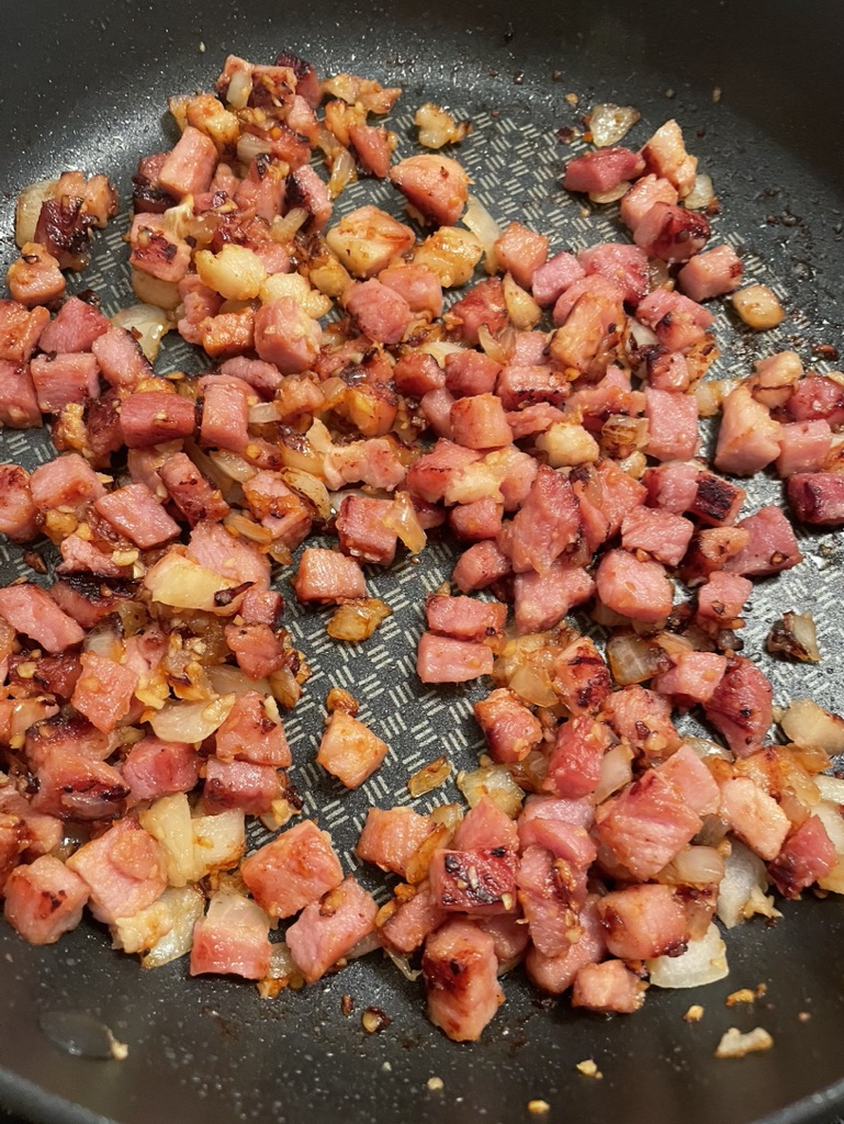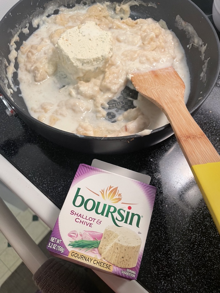 First, I started my pasta water for penne. Next, I diced a ham steak, chopped garlic and onions and then sauteed all in a pan with some pepper until crispy. Once crispy I removed them from the pan. I added a Boursin cheese block, butter and some flour to the same pan. I wanted to get a thicker saucer going. One it all combined well and thickened, I lowered the temp to a simmer. I added back my ham mixture and continued to simmer as the penne cooked. I tasted the sauce to see if it needed anything – it wasn’t cheesy enough. I thought I had shredded parmesan cheese but I didn’t. The other cheeses I had just didn’t seem to be the right one, so I skipped the added cheese.