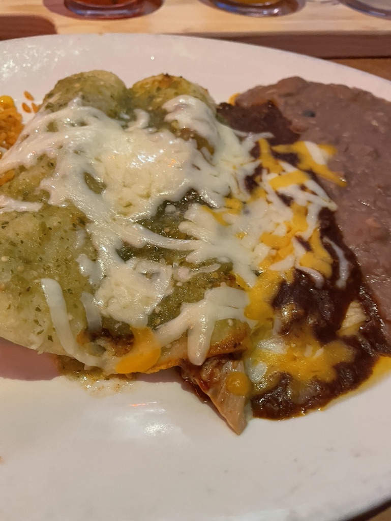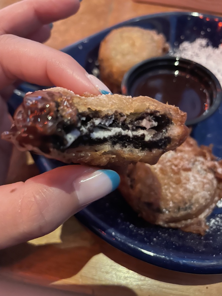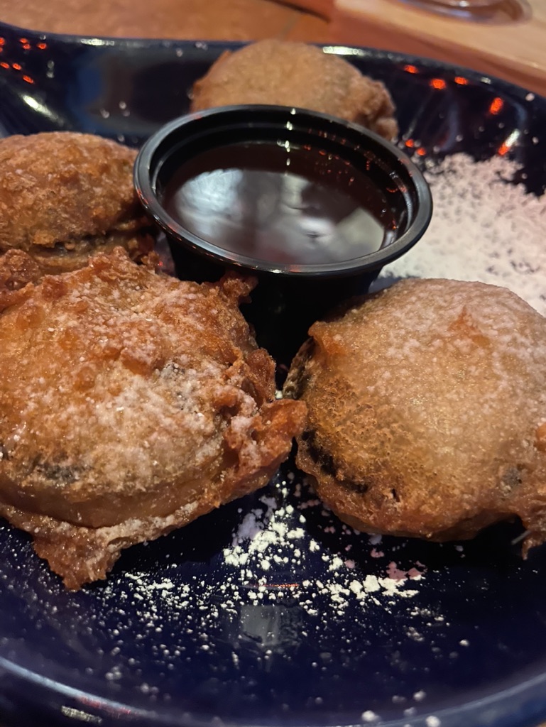 Menu: They over a wide variety of food and of course house made chips and salsa. Which are so addicting and hard to eat too many before your meal comes. Plus, they pair perfectly with margaritas LOL. I also like them a bit better than Chili’s as they offer more Tex-Mex and Mexican inspired combinations (not the bbq/chicken that Chili’s offers). It’s perfect for me who can never decide. I ordered a 3 combo platter with 1 pork carnitas, 1 cheese enchilada and 1 beef enchilada. I love that they are served with Mexican rice and refried beans. It was delicious, paired well with the marg flight. Apparently shopping made me hungry because I crushed it all with no leftovers. They had a dessert special of fried oreos … so this needed to be ordered for a sweet treat to end a wonderful meal! They came with a chocolate dipping sauce that made it the perfect pair. Check out their full menu here!