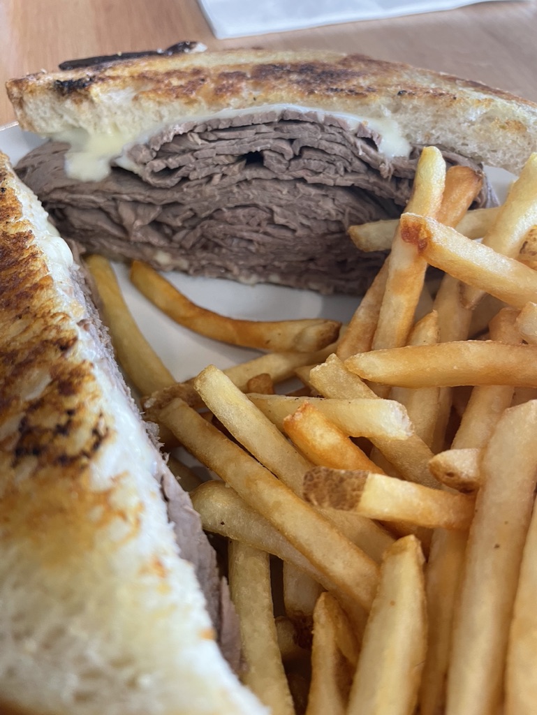 Menu: They do not have a large menu, but a great selection of bar bites, sandwiches, and some entrees. They had several mushroom items on the menu. If you know me, I love mushrooms. They are one of my favorite and being so close to Kennett, I try to order all the mushrooms when they are locally brought in! That being said, to start I had to order the creamy mushroom bisque. I only ordered a cup to sample, and next time will definitely be a full bowl. It was delicious, creamy and buttery with fresh mushrooms! For lunch, I ordered the prime dip grilled cheese. This sandwich was packed full of meat! Without a dip, I thought it would be dry. But it surprisingly wasn’t! The meat was still juicy with American cheese between two perfectly crispy sourdough slices. They came with a heaping pike of shoestring fries. Usually I am not a fan of the skinny fry, but these were fried perfectly. Crispy but still soft and chewy on the inside. The plate was big and enough to have leftovers the next day! I think next time around I want to try one of their burgers, probably the one with mushrooms! Click here for the full menu!