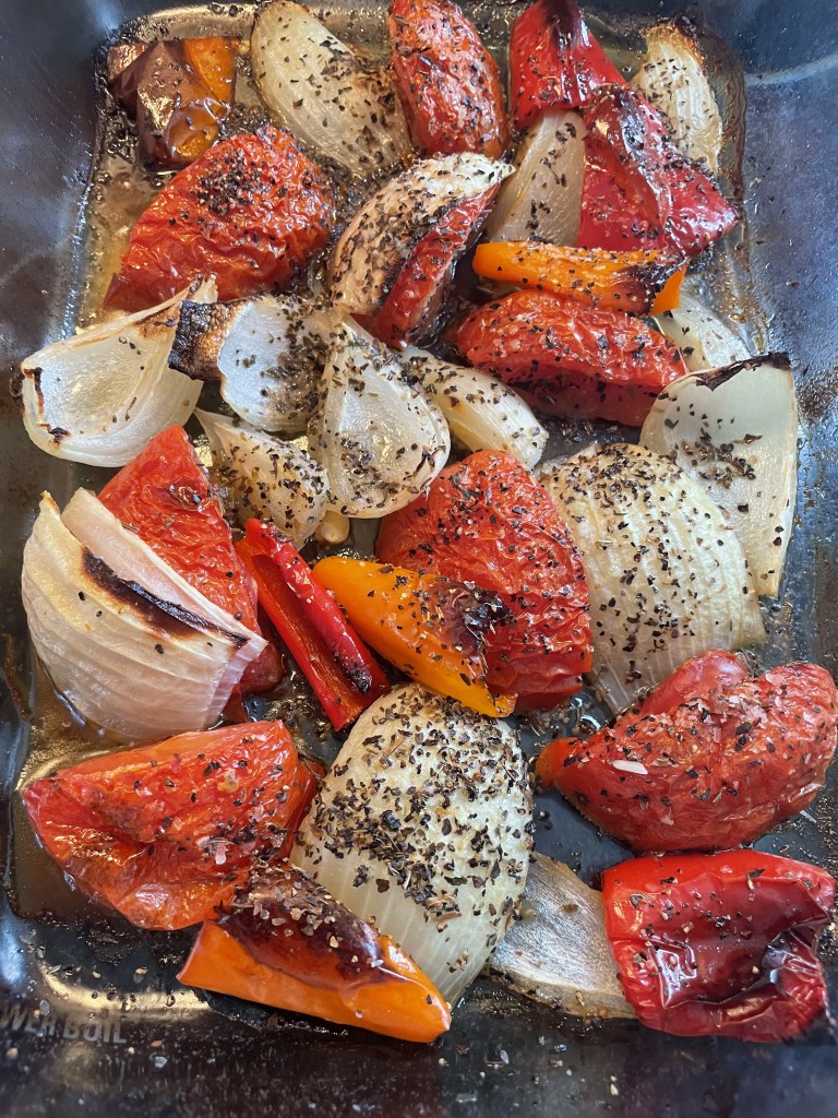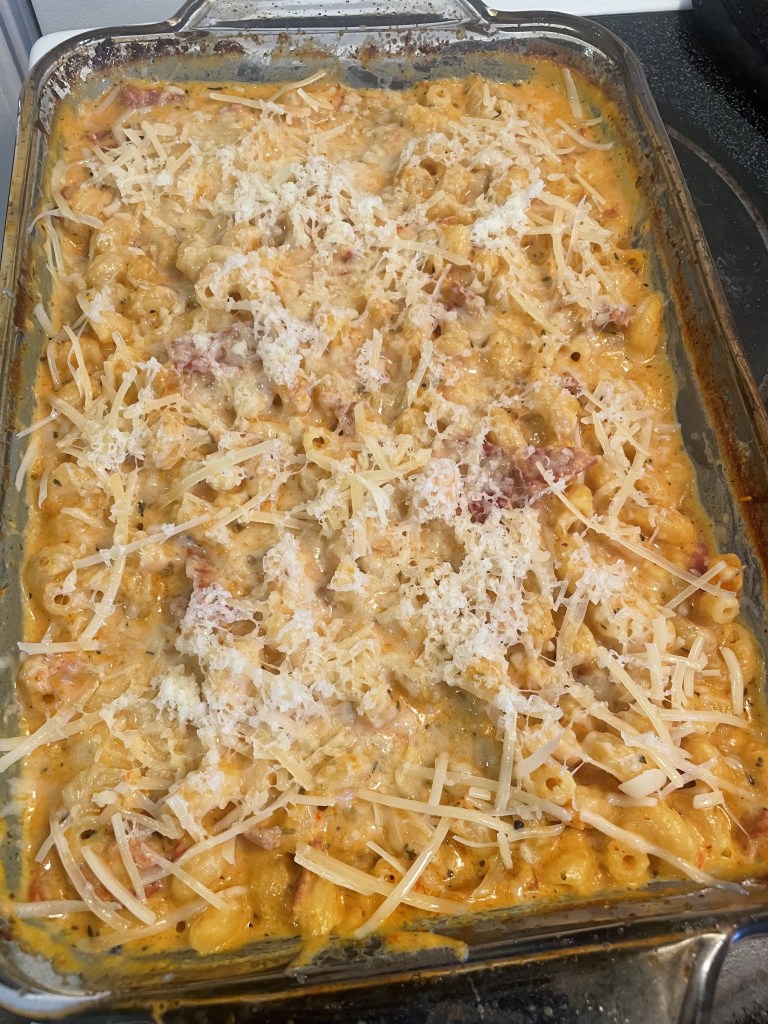 I started off by roasting some tomatoes, peppers, onions and garlic in the oven, They were seasoned with some salt, pepper, basil and EVOO. I removed them once finished and added them to the blender with 1 cup cottage cheese, splash of cream and blended until smooth. I seasoned a bit more after tasting it. I then poured this sauce into a large bowl with about a cup or some of cavatappi noodles (uncooked). I mixed in chunks of fresh mozzarella, chopped pepperoni and salami. Then added one cup of beef broth as I felt like there wasn’t enough liquid for the noodles to cook in. I had preheated the oven to about 400. I poured everything in a greased glass baking dish and covered with foil; baking for about 25-30minutes. When I checked it, I removed the foil, gave it a stir, topped it with some parmesan and baked it another 15-20minues until it was bubbling.