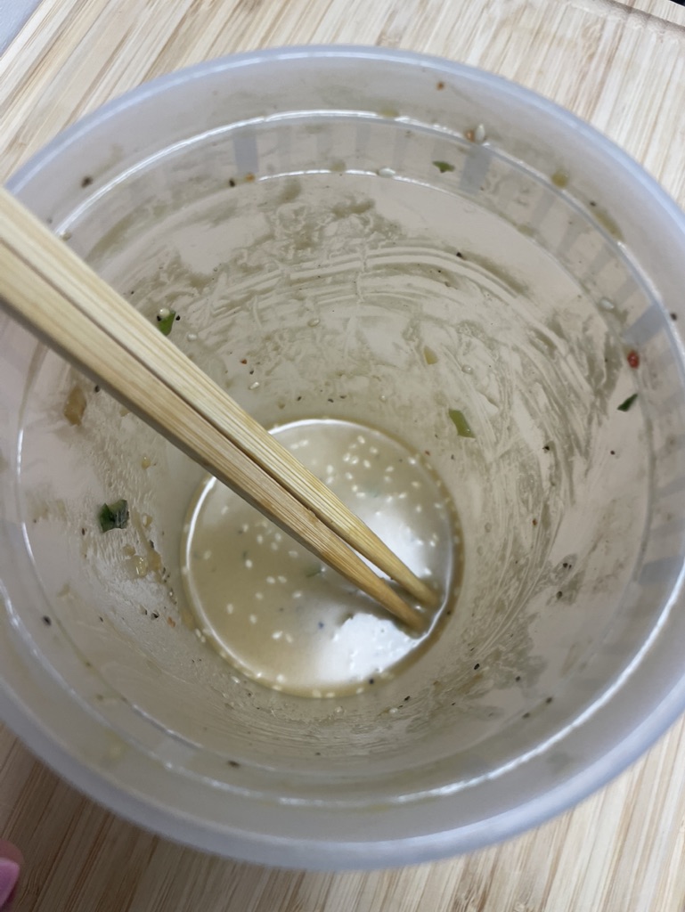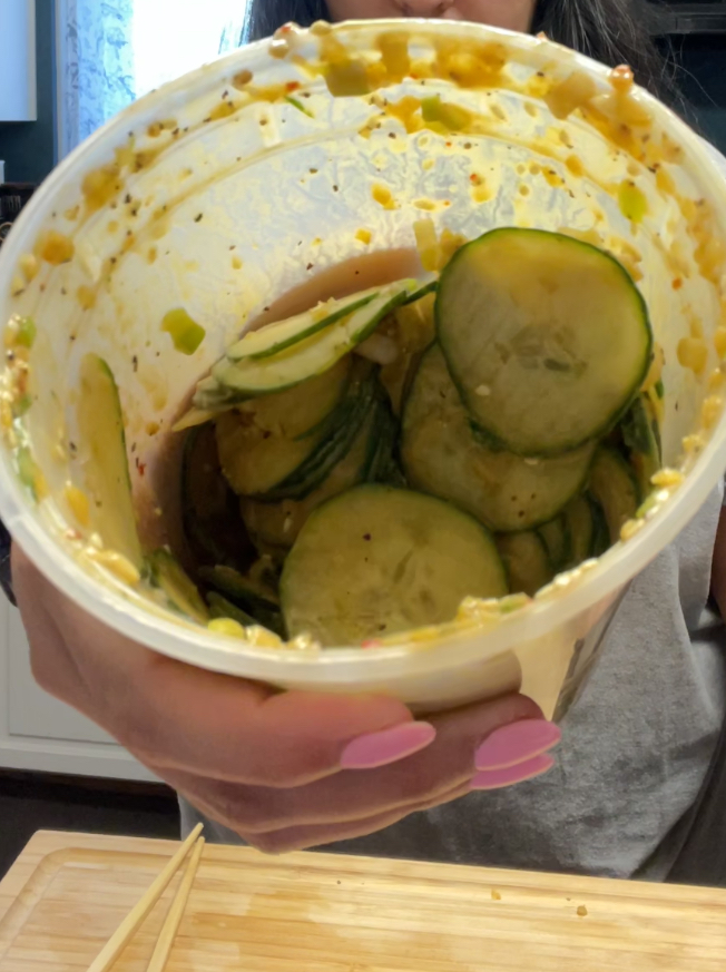 I started by slicing the cucumber. Yes, I did use my mandolin. No, I had no injuries, which I say is a win! I went with a simple Asian peanut dressing. So, I added a scoop of peanut butter, salt, pepper, minced garlic, chili onion crispy, soy sauce, sesame oil, fish sauce, rice vinegar, sesame seeds, and chopped green onions. Lastly, you give it a shake and let the magic happen. I measured everything with my heart, and it came out fairly balanced. I don’t think I had an overpower of one flavor over another. I love the combination and as I mentioned I did eat it all. But I do feel like the options are endless (as you see in all of Logan’s videos lol). It was fun, easy, and delicious. So, I do think you will see more recipes from me soon!