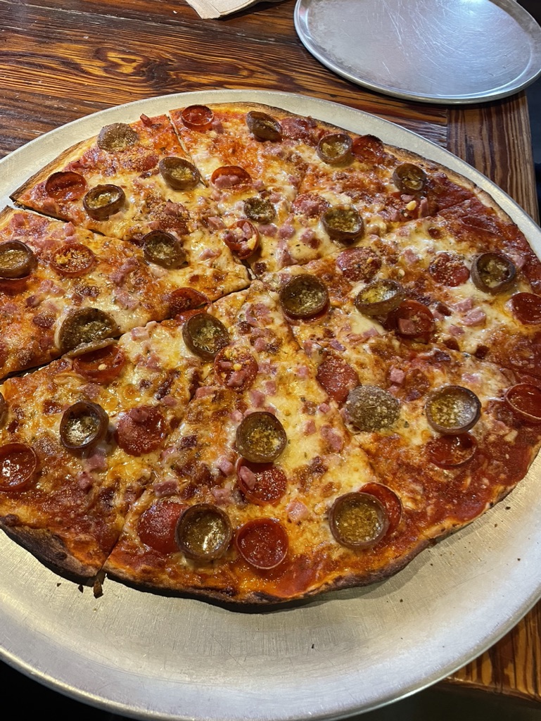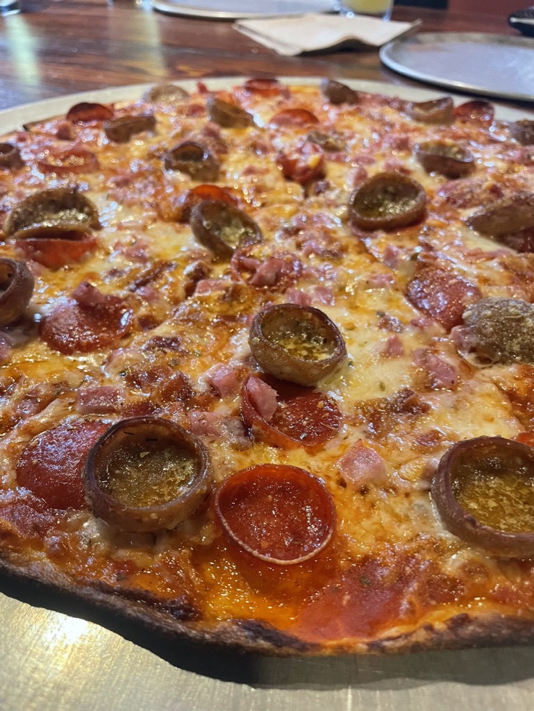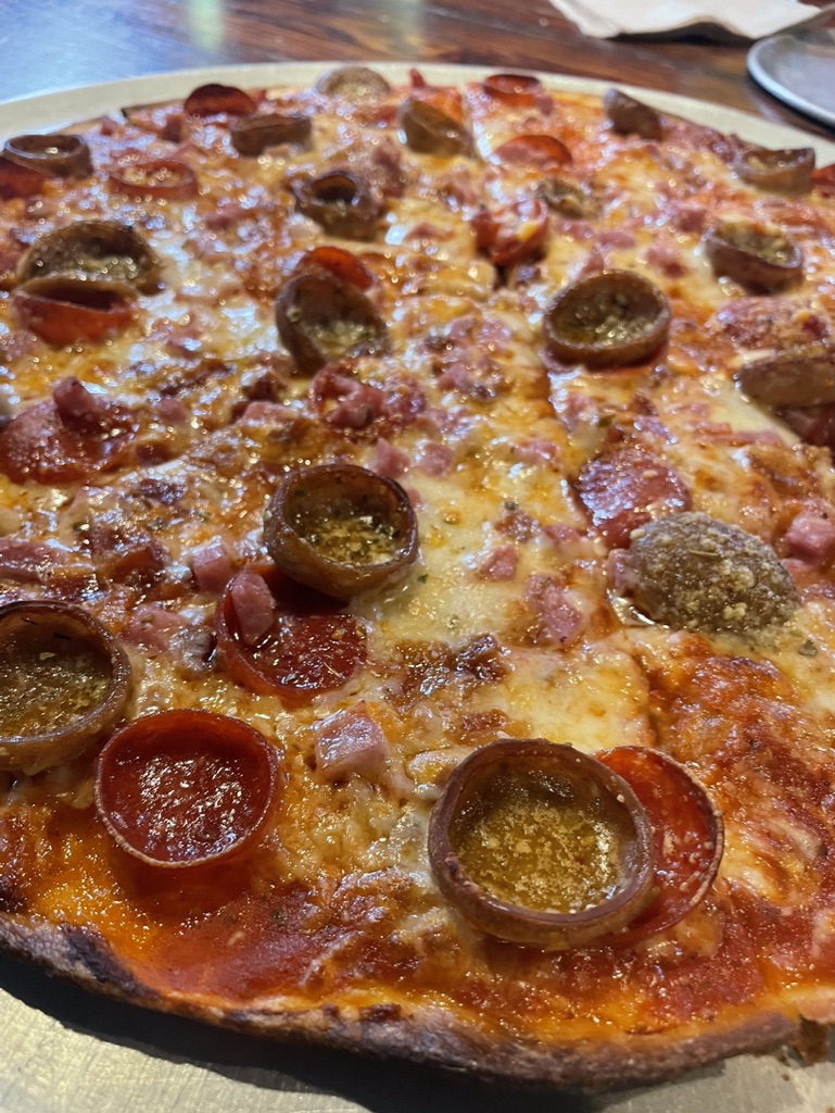Menu: They have a variety of handhelds and appetizers for you to chose from. But their known for their pizza too! We decided to order the meat lovers pizza. It had ham, pepperoni, and sausage. Ask for it extra crispy so the cheese comes out extra gooey and the crust is crunchy and not flimsy at all. They have a pickle pizza that I am dying to try next time!
