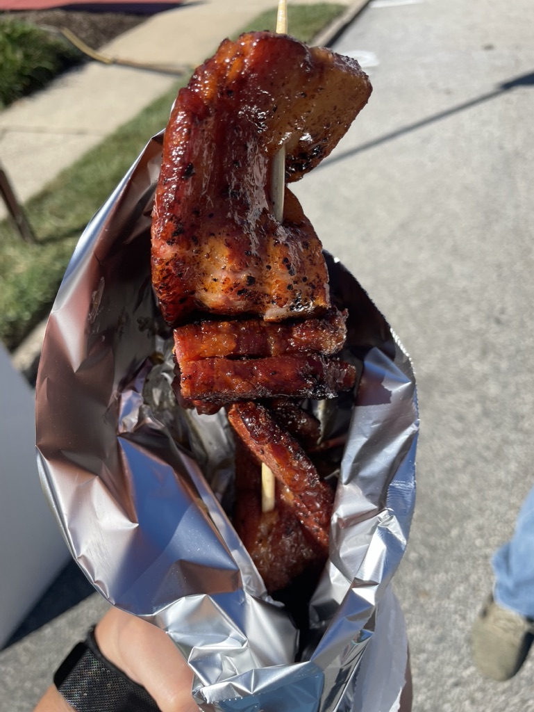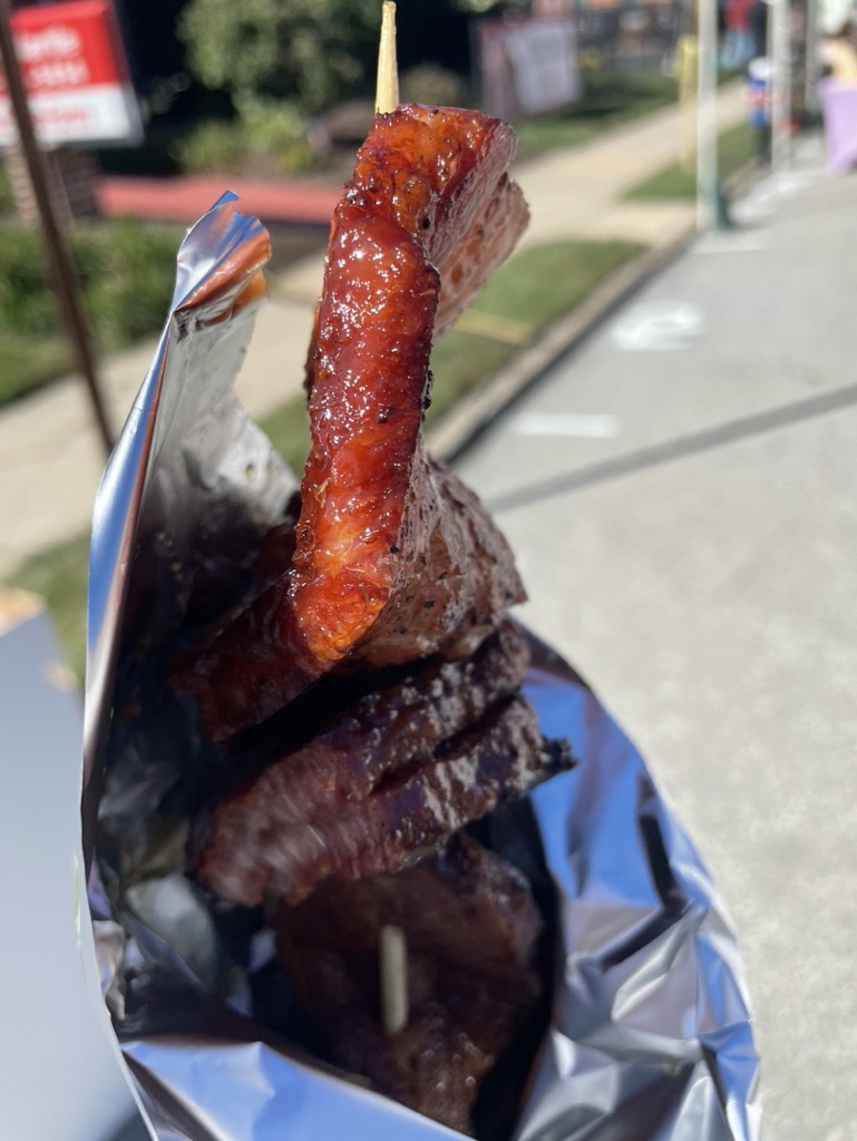 • Bacon on a stick: I mean how do you expect a Filipino to walk past a pork belly stand. Especially when all I could smell was bacon walking that direction. Once we found the source of the heavenly smell, I had to order it. This stand is based out of Philly and they had big pieces of pork belly fired up on all their grill tops. We opted to taste the jerk seasoning and the hot honey. The jerk was spiced perfectly, but it was a bit too much for me. I enjoyed the hot honey much better. It was the a slight zing of heat with a sweet finish! I think it was cooked perfectly too! Luckily it was served with foil, so you know I wrapped the last piece up for later to save room for the mushroom bites!