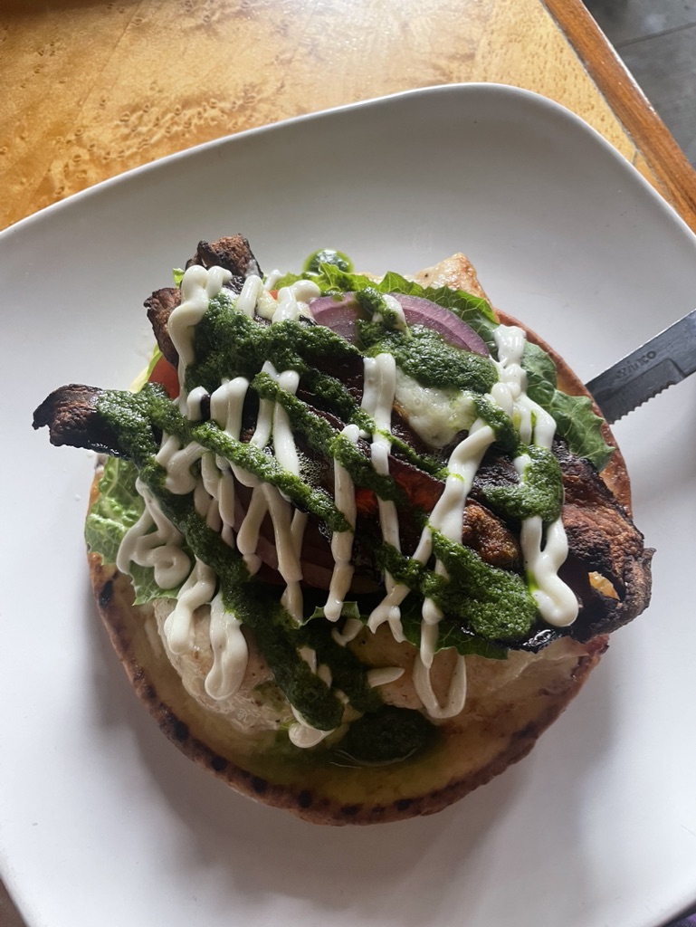 Menu: I did not look at the menu prior to coming . Though it was not big and overwhelming, it has so many good options. They have a cream of mushroom soup, so you know I had to try it. It was topped with a sherry finish. It was creamy and smooth, a very earthy and heart-warming soup. I missed the chunks of mushrooms, but it was worth every bite! I had a hard time deciding what I wanted to eat, but our server helped me select the chicken BLT on a pita. It was a delicious grilled chicken topped with cheddar, lettuce, tomato, and bacon. I was hoping it would be more inside the pita like a sandwich, but it was more open faced. It made it a bit more difficult to eat, but it was so good. They had it topped with a homemade basil mayo. The bacon was extra crispy and flavorful. It was a fun bite and gets over all a 8.5/10.