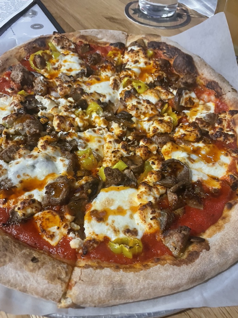 Menu: They do not have a large menu, as they do not have a full kitchen. They offer snacks, sandwiches, salads, and pizzas. We ordered a seasonal pizza that had sausage, mushrooms, and peppers. I like that it was a red sauce, and it was a great balance of toppings and cheese. It also paired well with beer! Dad ordered a cheesesteak that also was a delicious sandwich and paired well with beer lol.