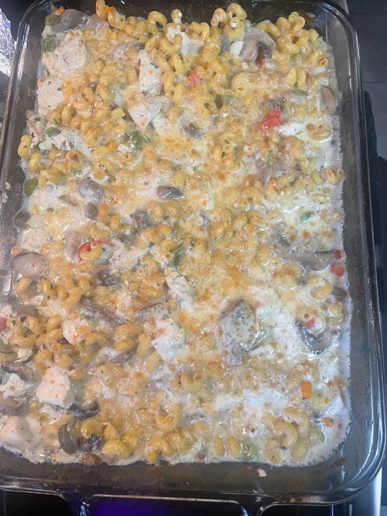 I preheated the oven to 375. My mis-en-place included chopped onions and peppers, minced garlic, canned mushrooms and diced chicken breast. I added all of this in a greased glass baking dish and I then added 1 jar alfredo sauce that I used 1 cup chicken broth to rinse out. I used 1 box of protein pasta and 1 borsin garlic and herb cheese block. I seasoned with some salt, pepper, and Italian seasoning, mixed together, covered with foil and baked for about 35 minutes. I removed the dish, mixed all together to incorporate the borsin cheese. I topped with some more shredded mozzarella and baked an additional 20 minutes.