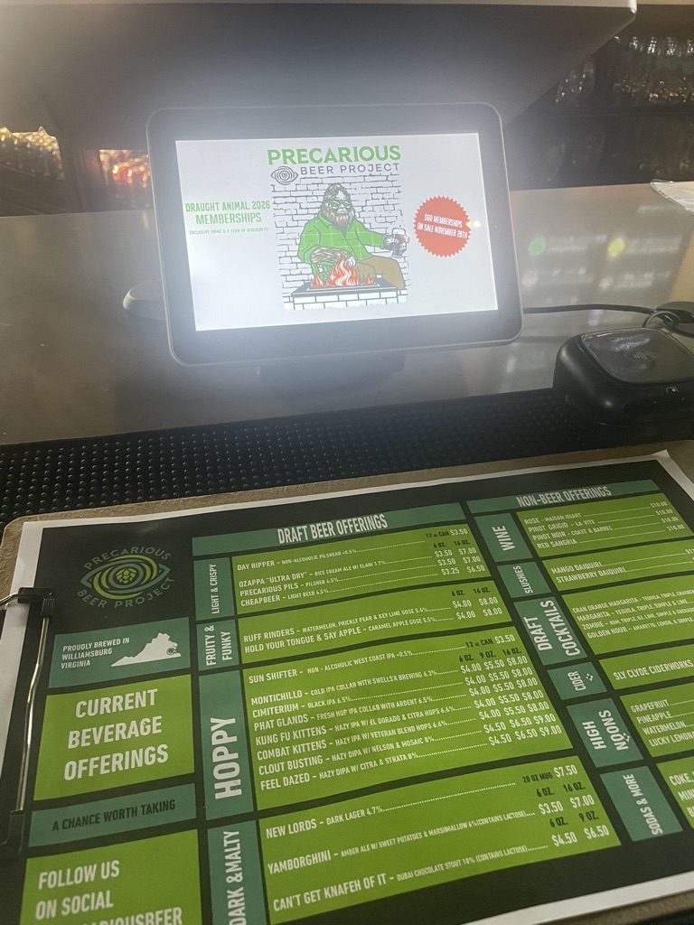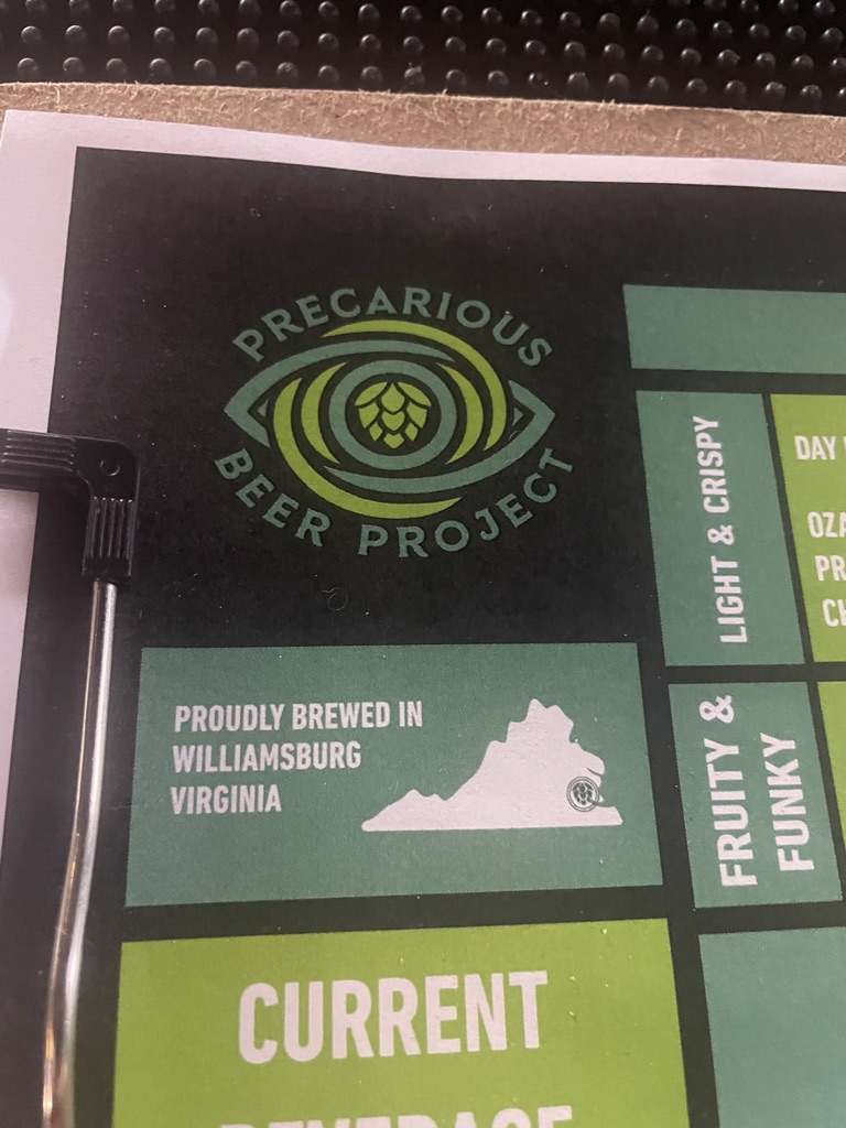 As I mentioned before, I had tagged some places prior to traveling. It just helps to narrow down options. I had all intentions to stop at the cheese shop while in colonial Williamsburg, but that afternoon, the line was out the door to order and you couldn’t even walk inside it was so crowded and busy. So we kept walking. We stumbled upon Precarious Beer Project, and I had completed forgotten that I had this place flagged. Though they were busy, we were able to find open spots at the bar so all was well!