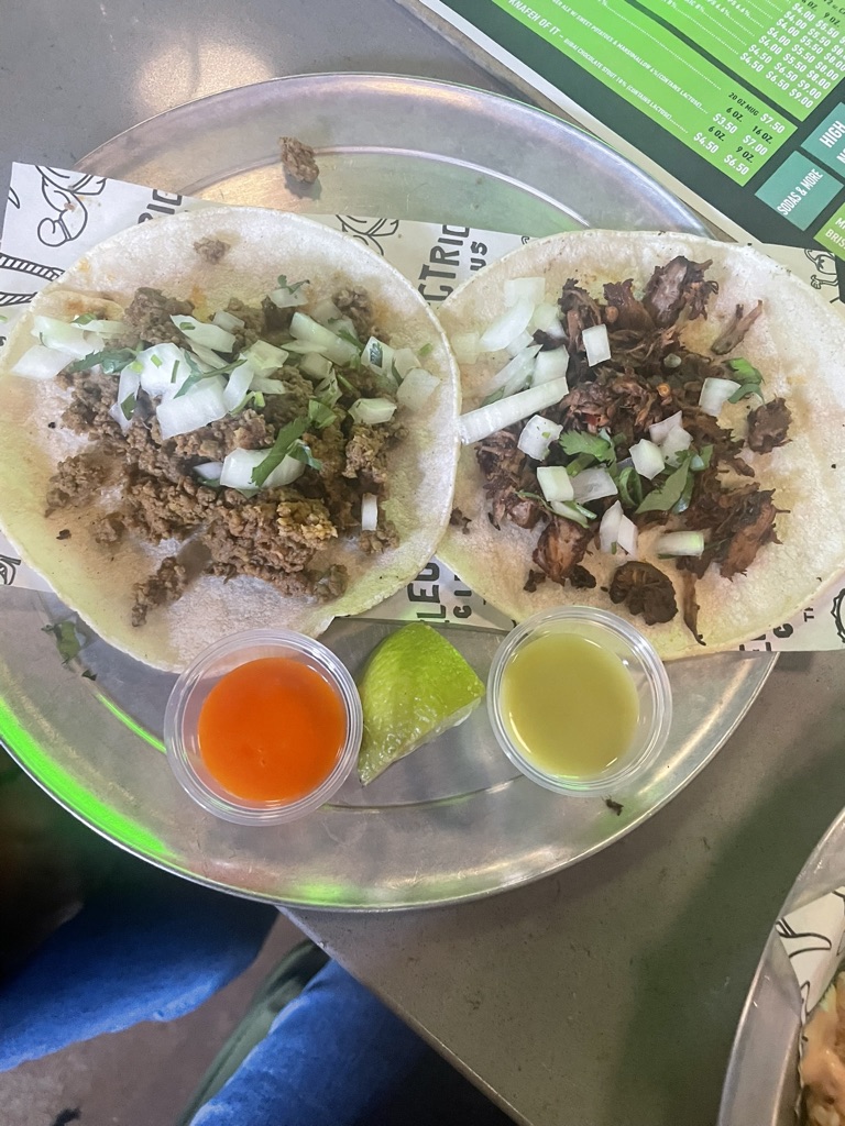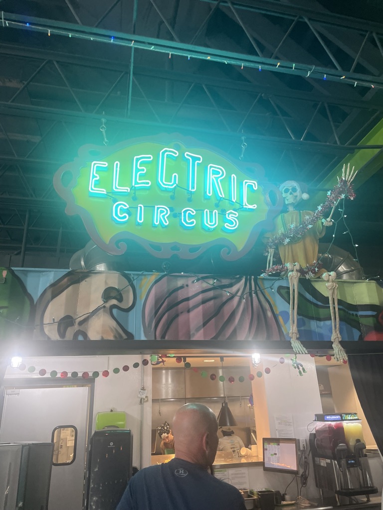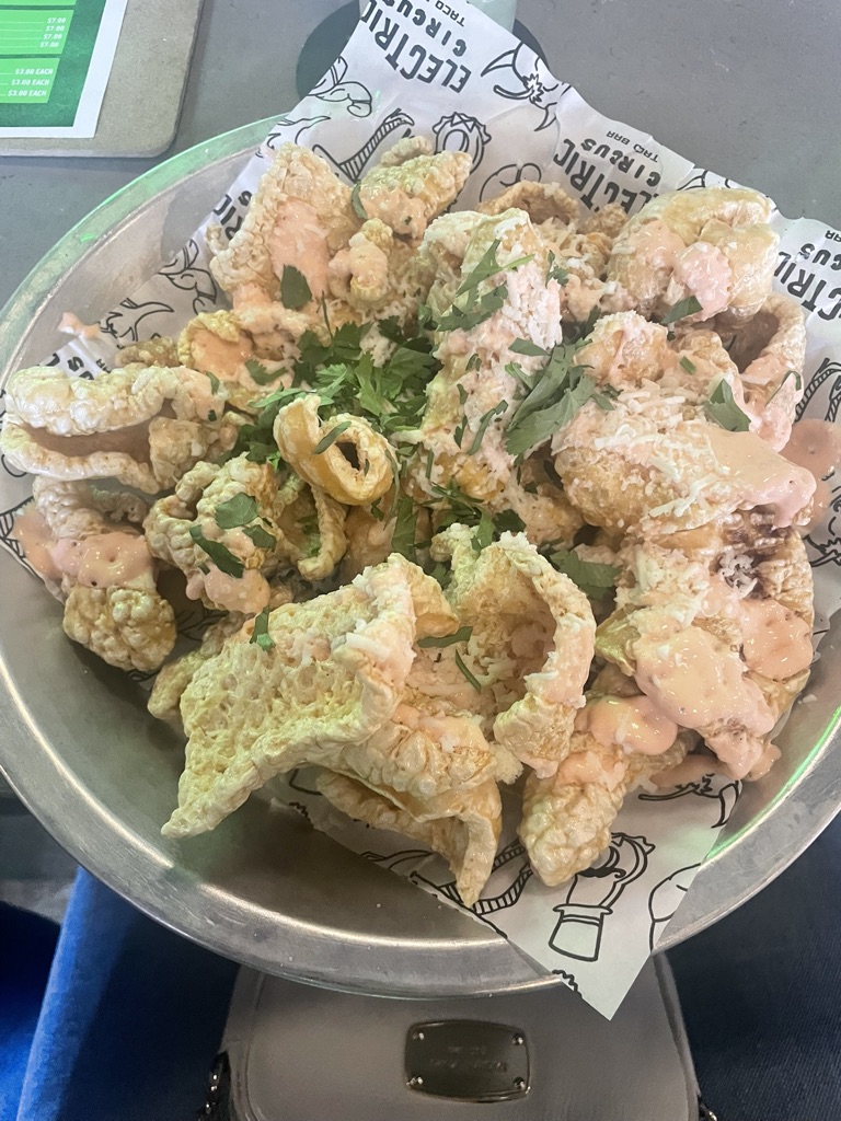 Menu: So they have two different food option inside. One burger spot and another a taco spot. Our seats at the bar happened to be closer to the taco spot, but their menu also sounded better. It was called Electric Circus. I went up with the plan to order their wings. They looked so good when they came out but also many people were recommending them. I was very disappointed that they were out by the time I was up to order. So instead, I ordered tacos a la carte. One ground beef and one carnitas. The tacos were a good small bite. Nothing special that makes them my favorite, but nothing bad that I wouldn’t order them again. I would give them a solid 7/10. They had homemade hot sauces, that of course I needed to try. They were packed with levels of flavor and heat. So an all-around win. And of course I also had to order the chicharrones! It was the biggest plate I had ever seen in an order! They were perfectly crunchy yet super light. They had a slight seasoning, with a chipotle crema drizzle. Topped off with some lime juice they were the perfect bar bite that went well with drinking! They get a 9/10. Click here to see more of Electric Circus’ offerings.